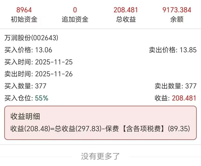 据工作人员提供的截图,某保户初始资金为8964元,11月25日以13.06元/股的价格买入377股万润股份,11月26日以13.85元/股的价格全部卖出,当天总收益为297.83元,扣除89.35元的保费及各项税费后,该保户当日收益为208.48元。
