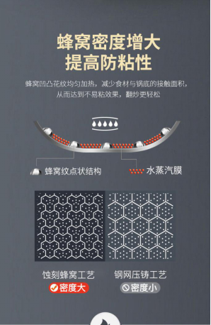 康巴赫解决了传统不粘锅会出现的涂层掉落的问题,避免了涂层和食物混合在一起被用户吃进去的健康问题。它在德国首创了蜂窝不粘专利技术,利用德国蚀刻工艺,在锅体表面雕刻出凹凸的精细纹理,看上去有点像蜂窝,所以也被称之为蜂窝锅。利用物理雕花的手段让凸出部分构成一张无涂层的蜂窝网状结构,等于给不粘锅涂层的表面套上一个保护壳,使得锅铲与不粘层零接触。另一方面,蜂窝纹理凹陷处会形成高温水蒸气膜,悬浮在食材与锅底之间,使得食物受热更均匀,这样做饭自然也更好吃。