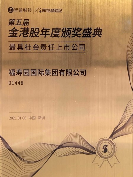 2021年1月6日,第五届金港股年度颁奖盛典在广东深圳举行,超过200家银行、证券、保险、信托、资管等金融机构以及上千位专业投资者出席了本次活动。福寿园国际集团凭借多年履行社会责任以及2020年疫情期间在生命服务和公益践行的优秀表现,与恒大、富力地产、国美、华住集团等十余家企业荣获“最具社会责任上市公司”奖项,这也是福寿园连续第二年获此殊荣。