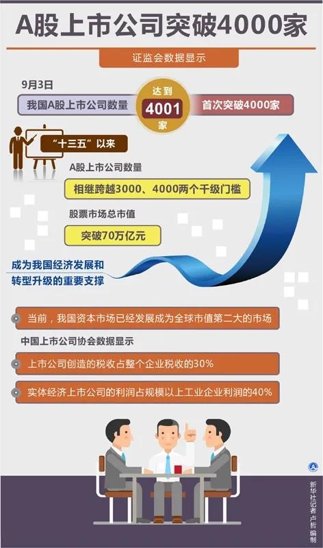 上市公司是资本市场的基石,在促进国民经济发展中发挥着重要作用,是我国经济发展和转型升级的重要支撑。中国上市公司协会数据显示,上市公司创造的税收占整个企业税收的30%,实体经济上市公司的利润占规模以上工业企业利润的40%。不仅如此,十三五”以来,我国A股上市公司数量显著增长。9月3日,证监会数据显示,我国A股上市公司数量已达到4001家,首次突破4000家,股票市场总市值突破70万亿元。