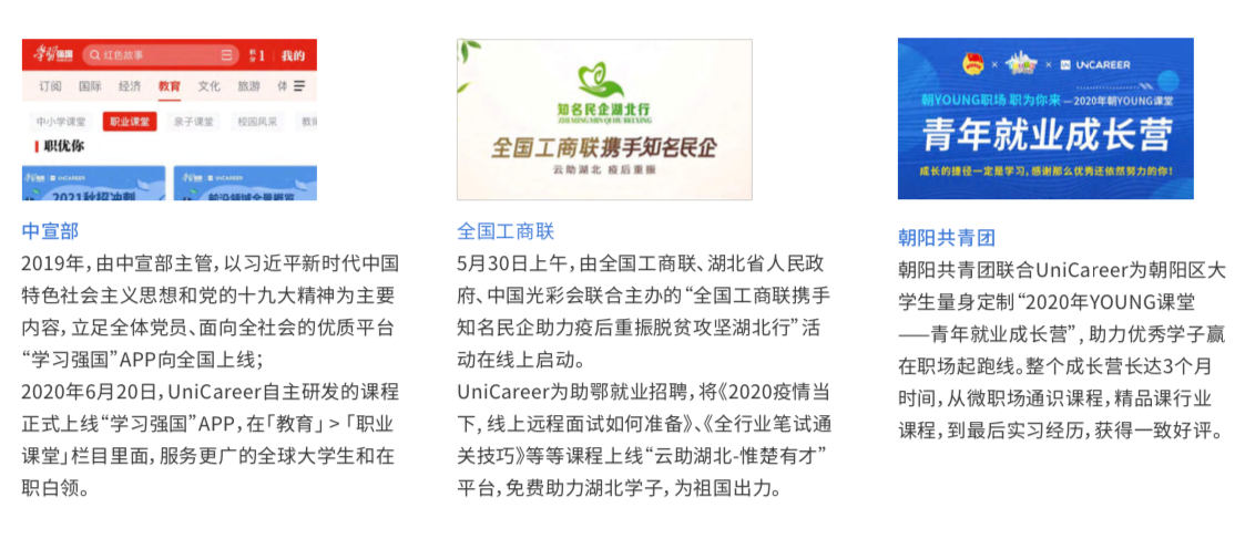 今年对UniCareer(职优你)重要的一年,我们收获了朝阳共青团的认可,共同助力国内大学生就业,同时,UniCareer(职优你)的课程内容上线“学习强国APP“,为全国大学生提供更多职业规划以及能力提升服务提供坚实内容后盾。