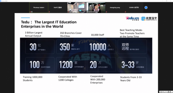 高玮随后结合产业需求介绍了达内科技在人工智能时代助力职业教育人工智能专业建设的实践和经验。高玮表示,达内科技作为中国IT职业教育赛道的领头羊,每年培训学员超过10万,在中国60多个城市有342家教学中心,合作院校1200家,合作企业20万余家,通过行业首创的双师远程教学模式为3-33岁年龄的人群提供终身学习服务。