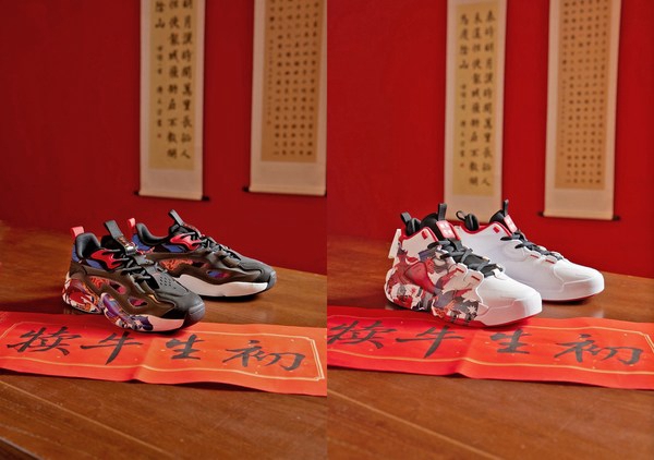 “初生牛犊”特别的图案设计除了在服装上展现外,也融合到鞋商品的设计中,主要有黑白不同配色的“霸道”系列。黑色款以酷黑为底,涂抹上新年的艳丽,中国山水线条勾勒出独特的复古时尚,白色款则与彩色碰撞,大气又不失特色,寓意少年一往无前。
