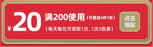 2、20元优惠券发放。广大宠物主每天每位可领取1次,1次3张劵,满200元即可使用,且可叠加3件7折的优惠;