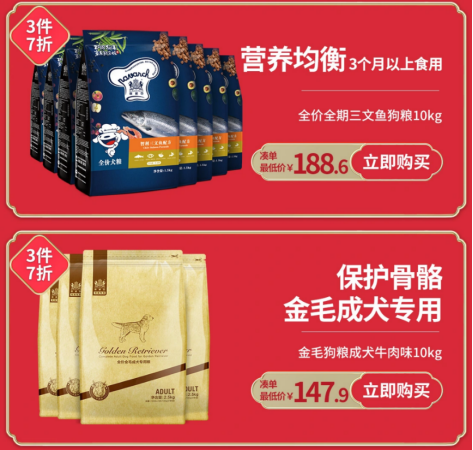 3、折扣:优质猫粮狗粮专区推出了“3件5折”活动,耐威克中大型犬粮15kg、耐威克牛油果全价通用犬粮1.5kg等犬粮均参加了“3件5折”活动;明星单品专区推出了“3件7折”活动,购买耐威克全价全期三文鱼狗粮10kg、耐威克金毛狗粮成犬牛肉味10kg、耐威克贵宾成犬牛肉味5kg等产品可享此折扣;星品推荐无谷冻干系列专区推出了“2件8折”活动,参加的狗粮产品有耐威克无谷冻干通用成犬粮6kg、无谷冻干贵宾成犬粮4kg等。