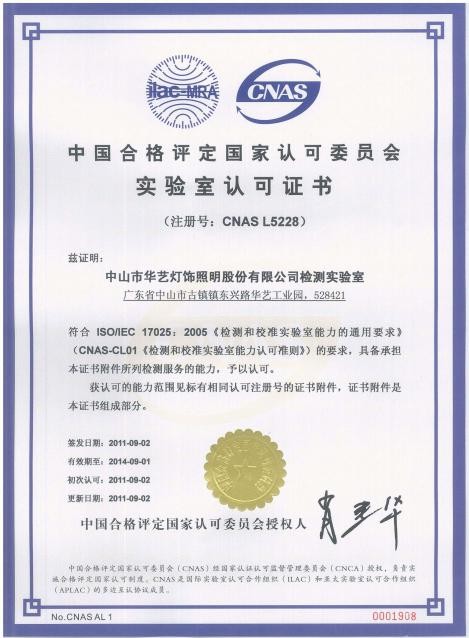 2000㎡华艺灯光检测实验室配备精准的检测设备和仪器,按照ISO / IEC 17025标准的要求建立完善的产品检测检验管理体系,具备第三方实验室资格,检测报告具有国际公信力。实验室已获得中国合格评定国家认可委员会 (CNAS)的认可证书,国际实验室认可合作组织ILAC承认协议(MRA)成员单位资质。