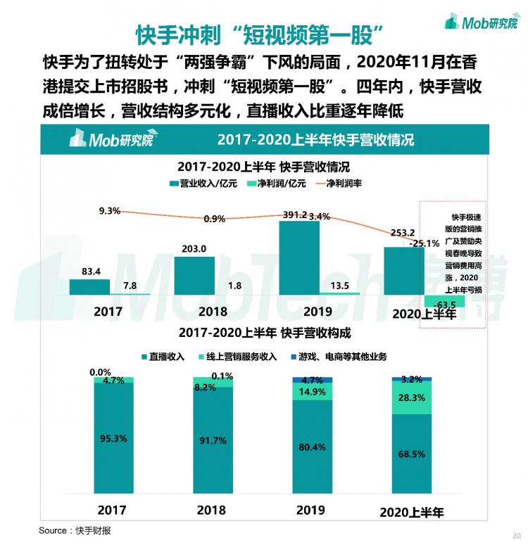 短视频:2020下半年短视频争夺战接近尾声,用户增长接近天花板。相比去年,用户规模增长5300万,月均使用时长增长1.4小时。就市场格局来看,短视频行业现已形成抖音和快手双雄争霸的稳定局面,其中快手2020上半年营收超200亿元,冲刺“短视频第一股”。