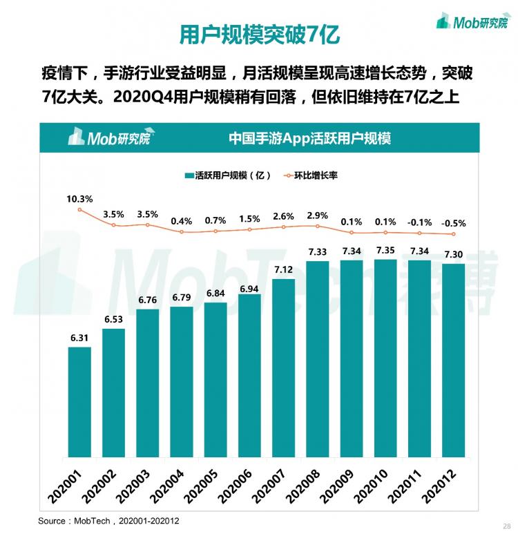 手游:2020下半年,手游活跃用户规模突破7亿大关,Q4稍有回落但依旧维持在7亿之上。原神、光·遇这两款新游戏表现优秀,挤进千万用户榜单。其中原神出海成功,上线首月全球吸金超2亿美元。