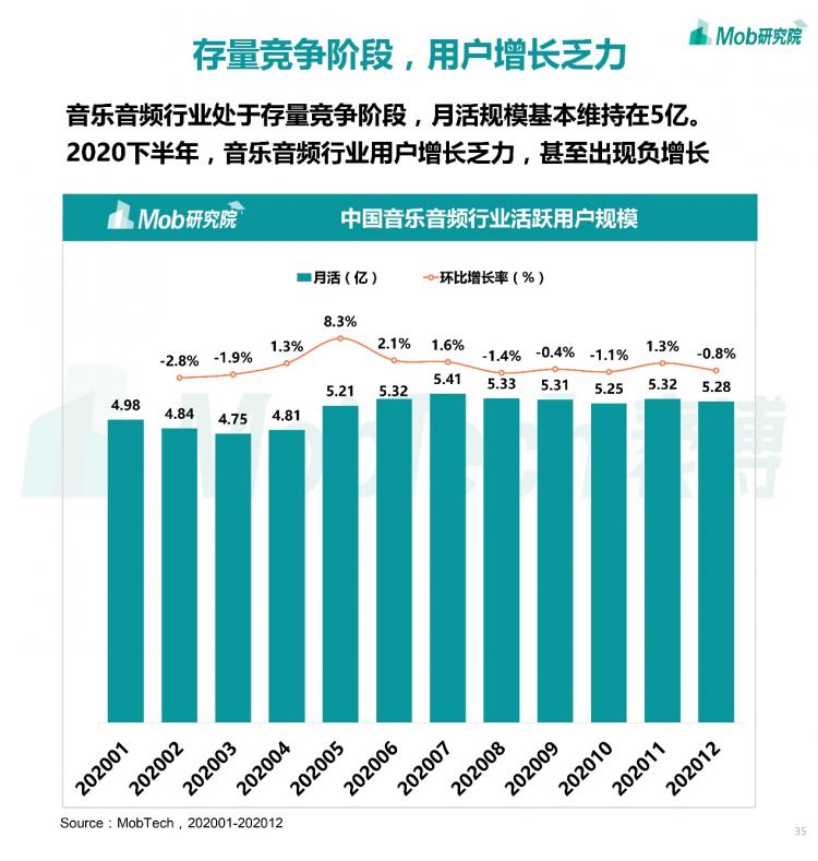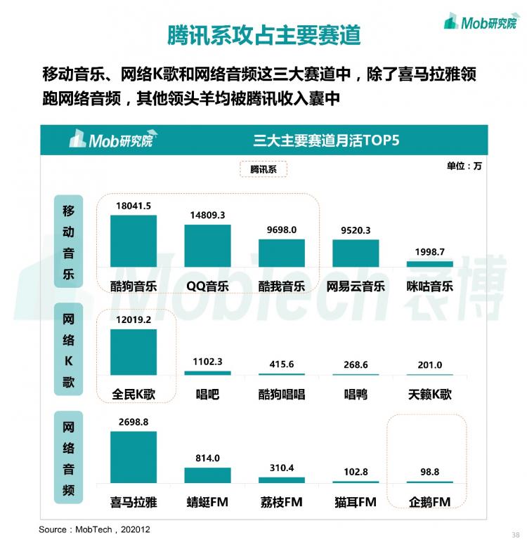 音乐音频:音乐音频行业处于存量竞争阶段,2020下半年行业用户增长乏力,甚至出现负增长。移动音乐TOP3均为腾讯系产品。网络K歌赛道,腾讯系一家独大,遥遥领先。