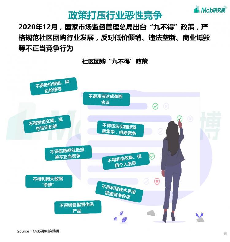 社区团购:2020年下半年烧钱卖菜大战愈演愈烈,阿里、腾讯等互联网巨头们一方面加大对社区团购企业的投资力度,另一方面积极布局自己的社区团购业务。2020年底,国家市场监督管理总局出台“九不得”政策,反对不正当竞争行为,规范行业发展。