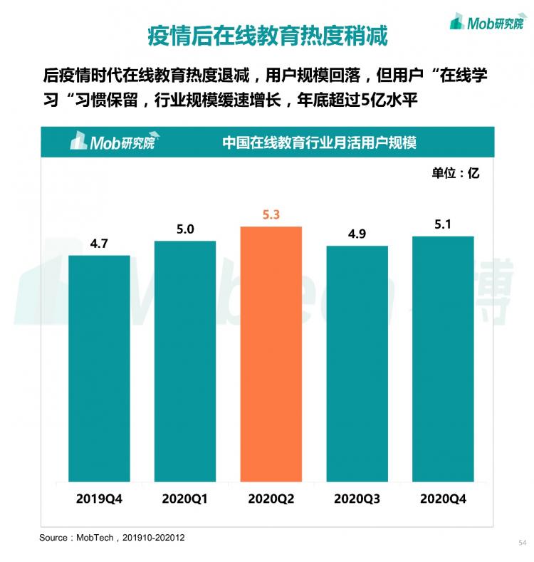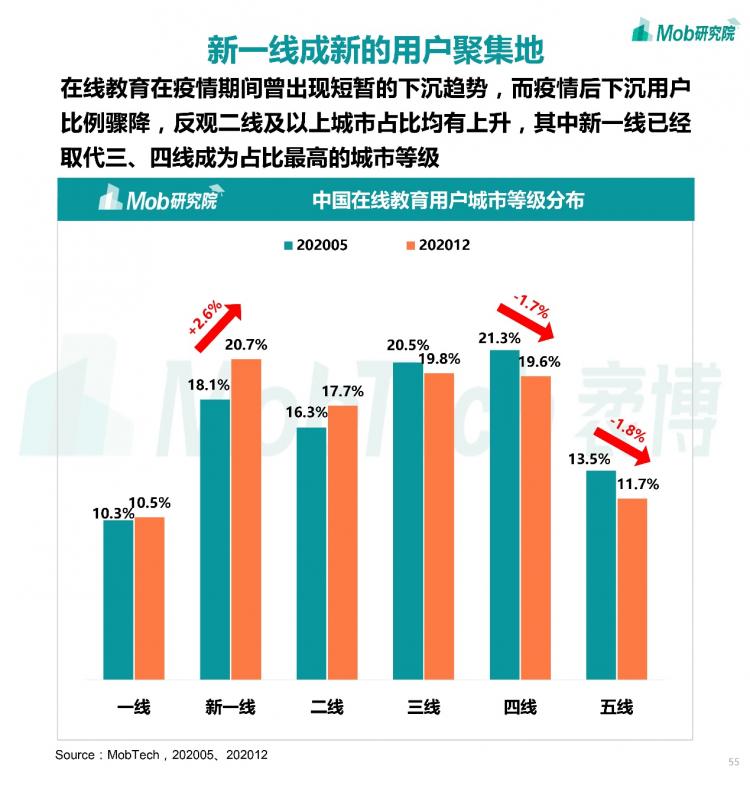 在线教育:疫情平稳后在线教育热度减退,行业规模下降,2020年Q4,行业规模再次回升,重返5亿水平。下沉市场用户比例下降,新一线已经取代三、四线成为占比最高的城市等级。