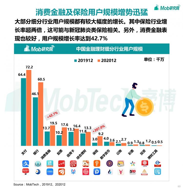 金融理财:金融理财大部分细分行业用户规模涨势迅猛,其中受疫情影响,保险行业规模扩大2倍。消费金融市场覆盖城市范围逐步扩大,用户整体呈现下沉趋势,三线及以下城市用户占比上升至57.9%。
