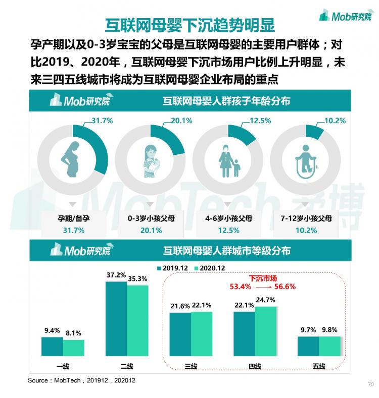 互联母婴:互联网母婴月活规模已突破3亿量级,其中孕产期以及0-3岁宝宝的父母是互联网母婴的主要用户群体;互联网母婴行业下沉趋势明显,未来三四五线城市将成为互联网母婴企业布局的重点。