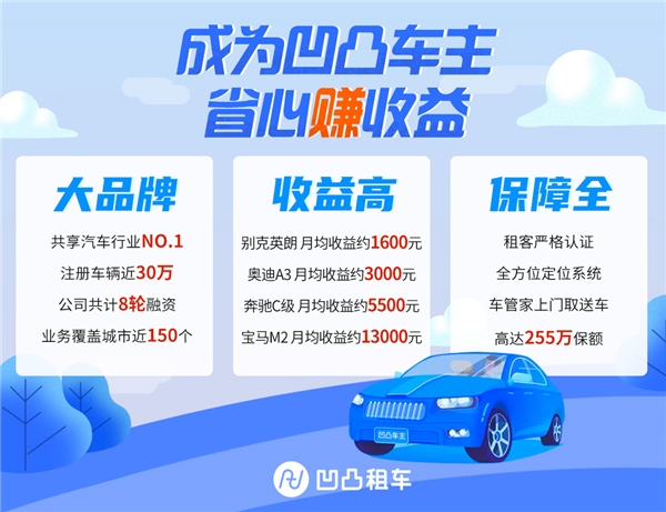 首先,凹凸租车是真正意义上的租车行业大品牌,覆盖全国超过了150+的城市。不仅仅在一线城市,在二线甚至三线城市都已经完成了品牌矩阵布局。依托品牌实力,凹凸租车能够将更高的出租收益给到车主,同时给予车主更加优质的出租体验。