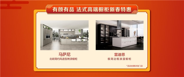 想更加深入体验法式厨房生活带来的便捷与优雅?在本次“新春送壕礼,定制年货节”活动中,以更优惠的价格示人的两款法式高端橱柜——拥有特别双层阶梯设计的马萨尼橱柜、以钻石造型演绎浪漫生活的雷迪恩,就是你不可多得的选择!