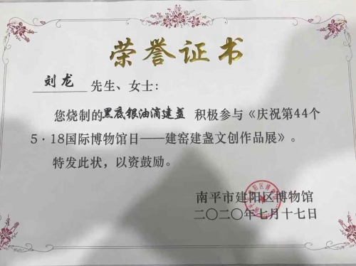 作为新生代建盏工艺师,刘龙在烧盏这条路上始终敢想敢拼,砥砺前行。正是这股韧劲儿与钻劲儿使得他敢于检省自己在烧制技艺上的不足,曾毅然前往瓷器名都景德镇潜心学习一年多,认真了解学习各大窑口的釉料特色、器型及烧制工艺。而所谓“术业有专攻”,进修回来他并不满足,随后他又拜入建盏大师、盏界知名女匠人阙梅娇女士门下,专攻创烧技艺,在恩师的悉心教授下,他很快取得了技艺方面质的飞跃,并在创作思路上产生了自己独特的灵感……