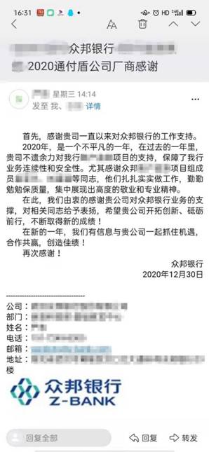 提要:通付盾在安全保障行业深耕多年,一直秉承“诚信、质量、效率、价值”的企业理念,为广大企业用户带来最优服务与管理,同时,多年来也深受广大用户的支持与肯定,在刚刚告别的2020年里,通付盾也收到了很多客户的感谢致礼,对于通付盾来说,这也是多年来通付盾全心全意的服务,所收货的最好回馈。