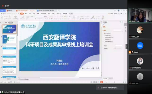 提要:2020年2月2日下午,西安翻译学院科技处召开2021年科研项目与成果奖申报线上培训会。本次会议围绕科研项目与成果奖申报技巧、常见问题及2021年上半年科研工作部署等内容展开