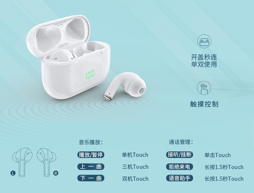 设备与耳机初始连接后,每次使用时开盖即可与设备进行自动连接,左右信号同步传输,不分主副耳机,单双耳模式无缝切换,取出任意一只都能单独使用;耳机上设有Touch控制按键,无论是音乐播放还是通话管理,只需轻触耳机即可完成,操纵更便捷,使用更舒适。