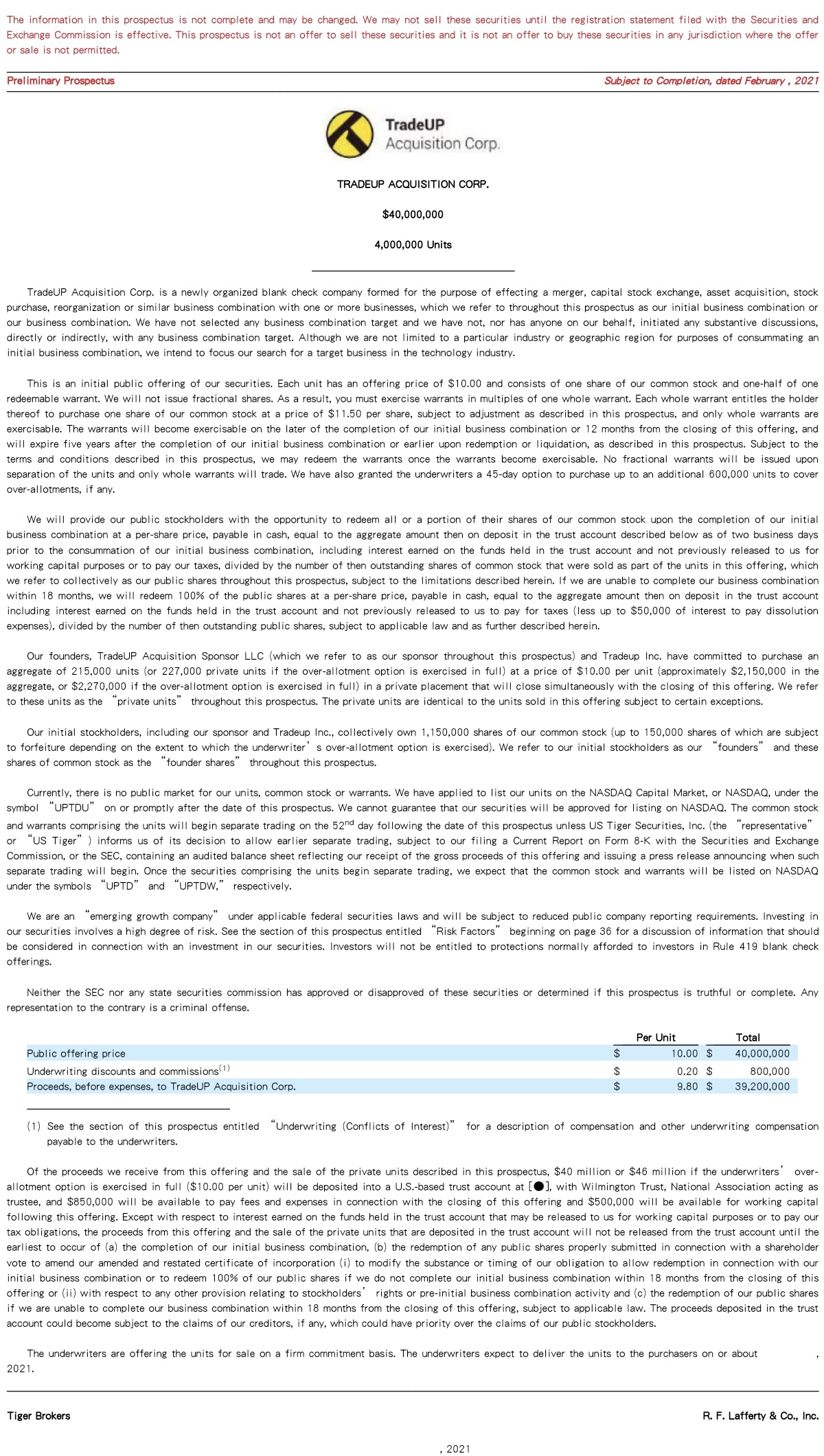 近日,老虎证券携真成投资创始人李剑威及众巢医学董事长杨伟光为一家SPAC(特殊目的收购公司)“TradeUP Acquisition Corp.”提交IPO申请。该公司将以“UPTDU”的股票代码登陆纳斯达克,每单位的发行价为10美元,包括一股普通股和0.5份的可赎回认股权证,预计募集4000万美元。招股书显示,老虎证券(美国)担任此次SPAC公司上市的主承销商。该SPAC打算在技术行业集中寻找标的公司。