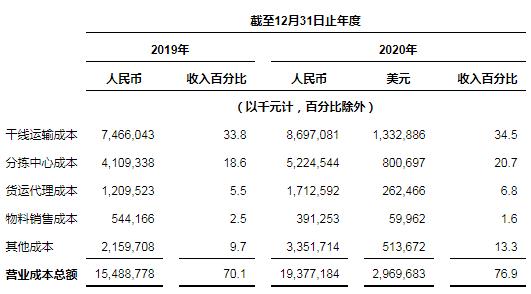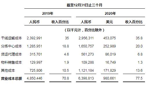 收入总额为人民币8,257.1百万元(1,265.5百万美元),较2019年同期的人民币6,846.5百万元增长20.6%。核心快递服务收入较2019年同期增长17.1%,该增长是由于包裹量同比增长46.5%以及主要由竞争导致的单票价格下降20.1%的综合影响所致。受全球COVID-19疫情导致的跨境电子商务需求激增和价格提升所驱动,货运代理服务收入较2019年同期增长92.1%。物料销售收入主要由列印电子面单所需的热敏纸销售收入组成,同比增长7.9%,远低于业务量增速,这是由于自2019年下半年以来低价格的一联电子面单使用率增加。其他收入主要由金融贷款业务和广告服务组成。