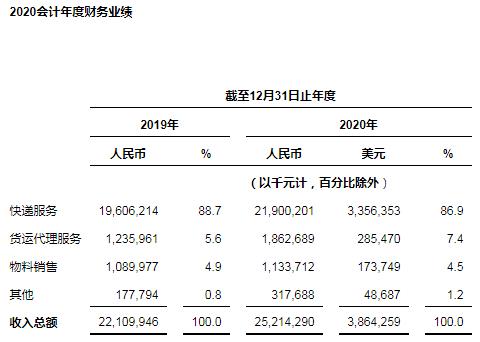 收入总额为人民币25,214.3百万元(3,864.3百万美元),较去年的人民币22,109.9百万元增长14.0%。核心快递服务收入增长11.9%,该增长是由于包裹量同比增长40.3%以及单票价格下降20.2%的综合影响所致。货运代理服务于2020年的全年收入为人民币1,862.7百万元(285.5百万美元),而2019年为人民币1,236.0百万元。物料销售收入主要由列印电子面单所需的热敏纸销售收入组成,同比增长仅4.0%,这是由于自2020年低价格的一联电子面单使用率增加。其他收入主要由金融贷款业务和广告服务组成。