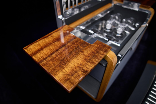 打开车门,定制踏板呈现字样:“献给劳拉与小杰克·博伊德·史密斯,英格兰古德伍德手工打造”。幻影仪表台区域由整块密封玻璃覆盖,这处独特空间被称为“艺境藏珍”画廊,客户可以在此区域定制独一无二的艺术与设计作品。在幻影“相思木”定制版的“艺境藏珍”画廊中,相思木木材在内饰之中的核心位置熠熠生辉,悠然散发自然之美。