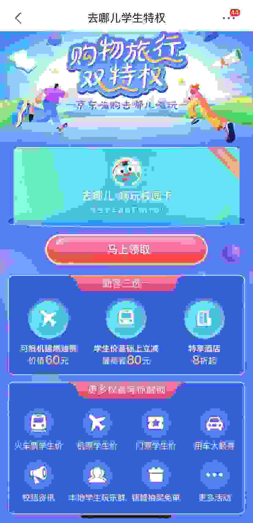 京东618在新的假期来临之际,联合去哪儿旅行针对“去远方”这一场景推出“嗨玩学生卡”购物旅行双权益矩阵,扩大学生卡权益,只要在去哪儿旅行APP完成学生认证领取京东权益,即可在京东APP享受学生专属权益,包括学生专享价、爆款好物1元抢、京东到家周卡、京东进口超市等在内的多项权益,覆盖生活、图书、在线教育、健康、驾考、维修、寄件等与学生密切相关的各个领域。在京东校园活动页面,领取“去哪儿旅行·嗨玩学生卡”,可享受“火车寒暑假每单折上减20(4单)”、“机票第一单免机建燃油最高60元”、“酒店8折满减券”三选一的专属出行权益,在6月邀请同学密友砍价,可解锁以0.99元的价格购买100元省钱券包的定期权益,力求让学生群体能够以最优惠的价格“行”其所爱。