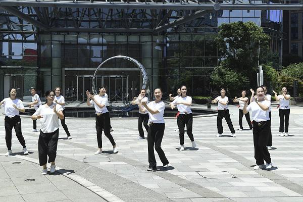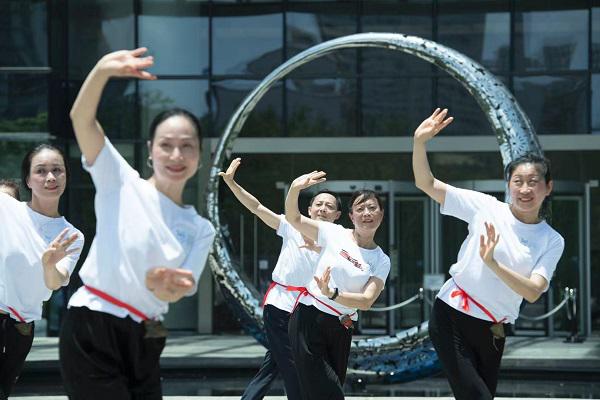 当天上午11时许,随着音乐响起,一群身着白色T恤、腰间系着粽子的舞者从四面八方涌入长沙世茂环球金融中心广场前坪,伴随着动人的旋律,她们扭扭腰、摆摆手、摇摇头,高喊“让世界健康起来”的口号,跳起了律动感强劲的广场舞。优美的音乐也带动了广场周边散步休闲的人们加入其中随音乐起舞。现场,多彩的舞蹈、矫健的身姿汇成一片其乐融融之景,共同组成了一道靓丽的风景线。
