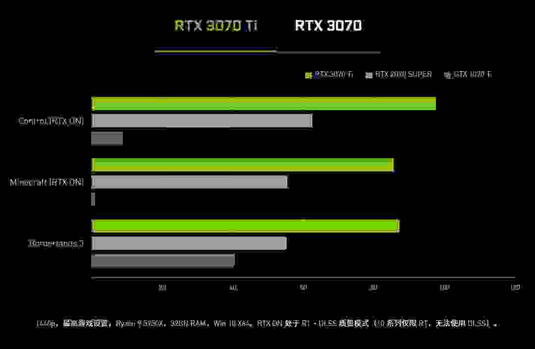 GeForce RTX 3070 Ti 带来1.5倍于GeForce RTX 2070 SUPER的性能提升,游戏帧率比GeForce GTX 1070 Ti高2倍。
