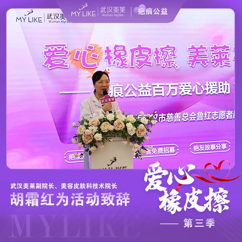 武汉美莱副院长、美容皮肤科技术院长胡霜红在致辞中表示,武汉美莱坚持品质塑美23年,始终秉承着“以人为本,疗效为先”的理念,撒播爱心,传递希望,服务于人民,服务于社会。为帮助众多患者早日摆脱疤痕困扰,全力突破身体、心理和经济三重压力;这次也非常荣幸能够继续携手武汉市慈善总会鲁红志愿者服务队共同举办爱心橡皮擦,美莱在行动第三季,面向全城的疤痕招募公益活动,让更多人了解医美公益、参与医美公益,传递更多大爱。
