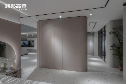 中庭隔断柜,创新采用曲面工艺圆滑包裹,将睡眠区与衣帽区作自然分隔。