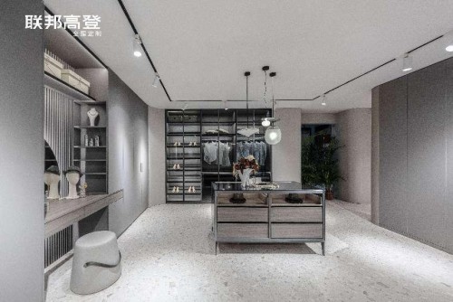 L型衣帽间藏露得当,极简灰调深邃安静,仿佛为空间扬起了舒缓而静谧的奏鸣曲。