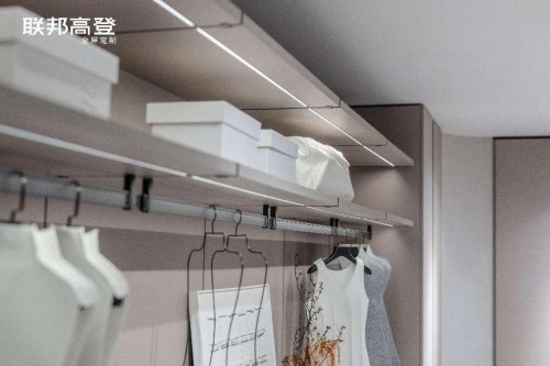 挂墙式衣帽间设计让收纳更得心应手,背板与柜体同色打造和谐兼容、智能灯带辅助打满,勾勒时尚新贵别样精致态度。