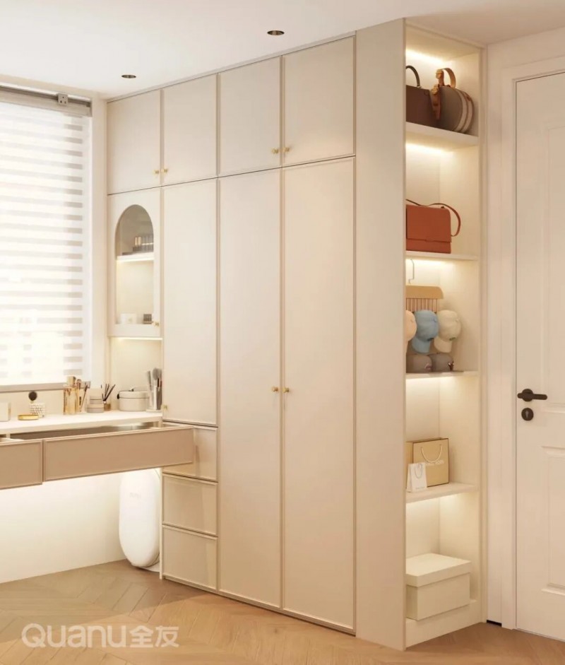 若空间较为狭小,也可利用台面与衣柜连接处设计开放格,化妆品、饰品上柜收纳,节省桌面空间,视觉更整洁。