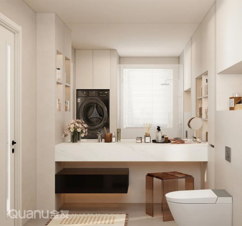干区卫浴台面延长,一端用于洗漱,一端用于梳妆,侧面墙作壁龛或嵌入式收纳柜,护肤品、彩妆、饰品各有专属分区。