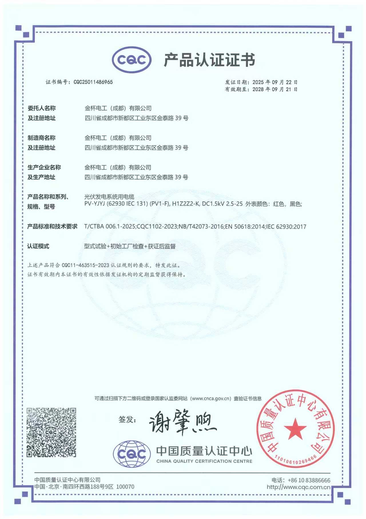 提要:近日,中国质量认证中心(CQC)“守正创新·线缆新关注(南京站)”技术交流大会隆重召开。金杯电工(成都)有限公司作为四川省线缆行业知名企业,受邀出席。公司凭借在光伏技术研发上的深耕布局和对产品质量的严格把关,光伏发电系统用电缆获得CQC产品认证证书,标志着公司在光伏电缆领域的技术实力与品质标准获得权威认可。