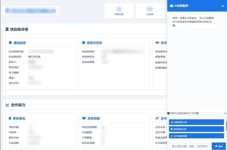 AI风险面板,构建了统一的“指挥中心”,海量数据共同组成了专家智囊团。它配备的“AI分析小助手”,能在审批合同时,实时分析供应商的历史表现、合同履约风险,并直接给出预警和建议。这让管理者的决策不再是“凭经验”,而是基于数据“早知道、早应对”,寻找更多优质合作伙伴,一起玩耍、一起发展。