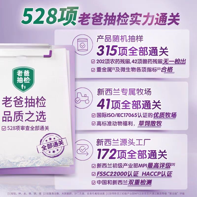奶源工艺:新西兰黄金奶源带专属牧场,采用TRUE a2品控体系,生乳一次成粉工艺保留营养活性。