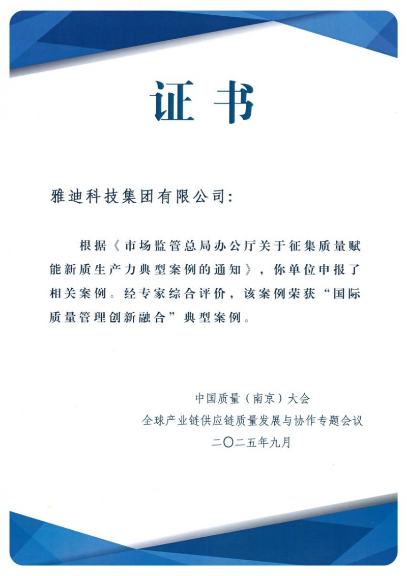 前不久,在中国质量(南京)大会“全球产业链供应链质量发展与协作”专题会议上,25个具有国际水准的质量管理案例被列为“国际质量管理融合创新”典型案例。雅迪科技集团作为电动两轮车行业唯一入选企业,与比亚迪、宝洁、伊利等领军企业共同跻身这一国家级名单,标志着其质量管理实践获得了国家层面的高度认可,让电动两轮车行业站到国家质量叙事的主舞台。