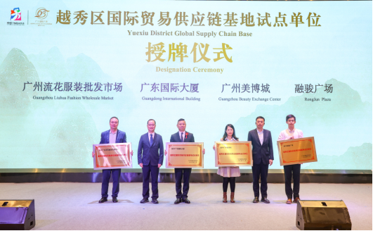 活动现场,广东国际大厦、广州美博城、广州流花服装批发市场、融骏广场作为越秀区国际贸易供应链基地首批试点单位,接受越秀区商务局的授牌。随后,广东国际大厦分别与中国联通、广州美博城、广州流花服装批发市场、通济隆集团、大旗财税签署战略合作协议,各方将整合优势资源,共探供应链创新发展路径,拓展国际交流合作空间。