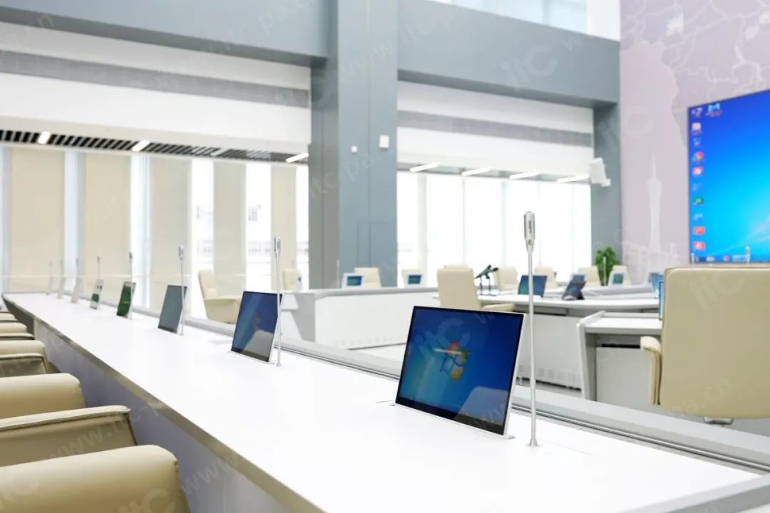针对气象中心会商研判与技术研讨的高频次会议需求,itc为其两大会议场景部署了 自研的国产双面屏无纸化系统。 该系统高度集合升降式数字会议话筒、无纸化终端主机、高清网络编码模块等多种媒体设备,可实现无纸化升降器、数字会议单元的统一升降管理,完美适配气象中心高端会议场景。