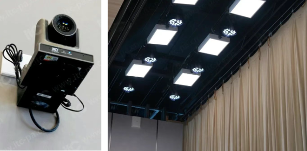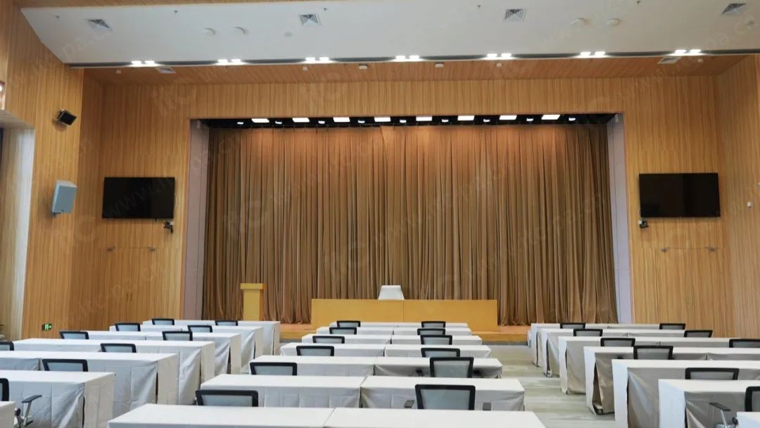 舞台灯光系统采用节能光源与智能控制系统,搭配机械幕布 ,营造出庄重且温馨的舞台氛围,既增强会场视觉效果,又烘托活动氛围,为专题汇报、技术交流及文艺演出提供了专业灯光支撑。