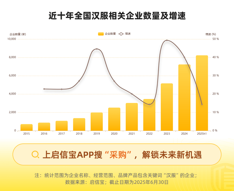 从企业数量层面来看,启信宝数据显示,近十年来国内汉服相关企业出现过两轮爆发式增长,其中2019年增速超40%,2023年增速接近50%。前者恰逢社交媒体普及高峰期,反映出汉服文化逐渐破圈,获得“Z世代”的广泛认同;2023年的第二轮增长,则伴随着曹县走红以及电商、供应链体系的完善,标志着汉服产业进一步走向大众化与规模化。根据2025年6月最新数据,汉服相关企业增速已回落至15%左右,几乎处于十年来最低位,体现出行业竞争的激烈态势。