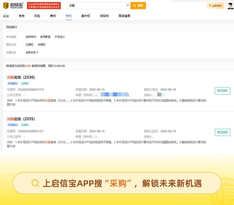 伴随着汉服走红,“山寨横行”的问题也频繁出现。针对这一痛点,曹县通过成立知识产权快速维权中心,将外观专利审批周期从传统180天压缩至10天,以激发企业知识产权创新的积极性。启信宝数据显示,目前“汉服”相关专利数合计约680条,其中外观设计专利占比达82%。