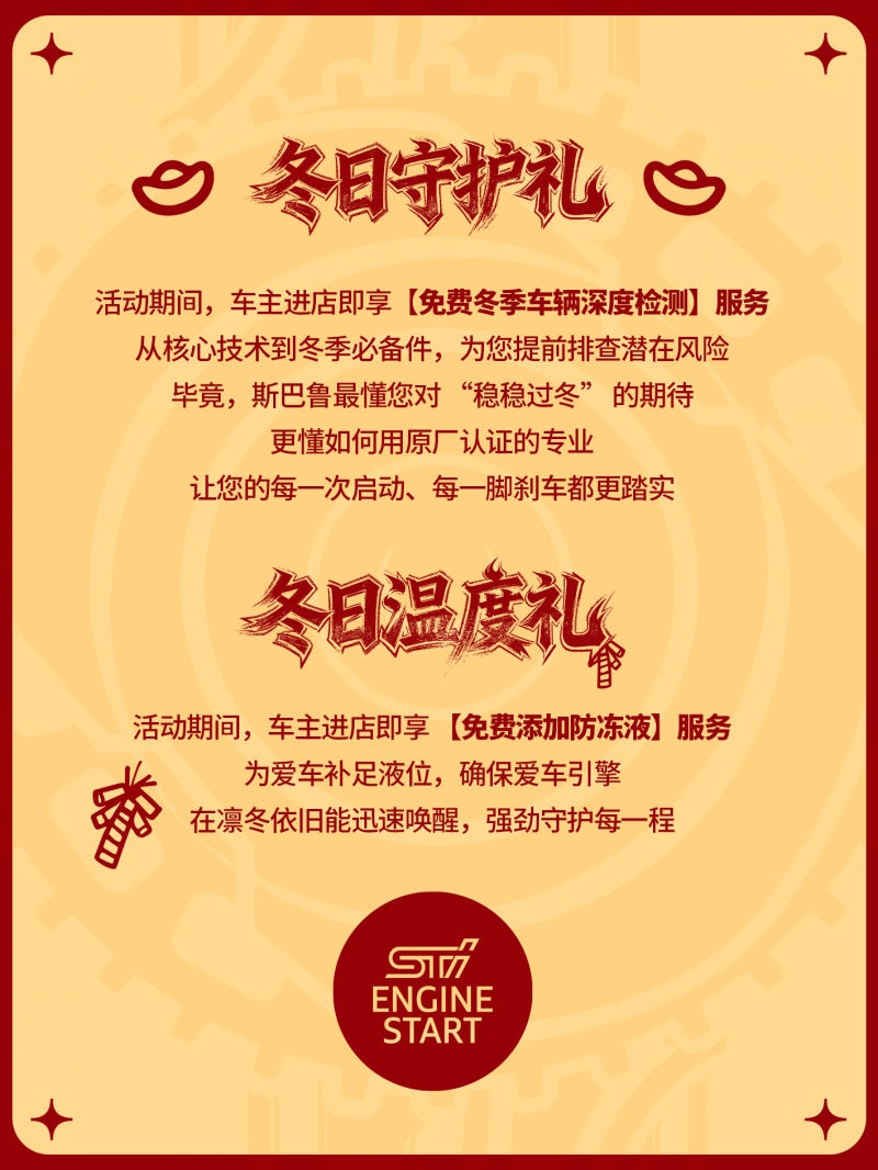 活动期间,车主到店进行定期保养并更换斯巴鲁纯正机油,即可免费获得斯巴鲁精心准备的“福气满满”纳福礼。这份好礼包含斯巴鲁专属祝“福”福字贴两张,寓意新的一年红红火火、福气连连;还有斯巴鲁“一键启福”红包袋六个,红包上印刻着STI启动键图案与水平对置发动机图案,承载着“一键启福”与“福运平稳”的美好心愿。此好礼全国限量10000份,先到先得,车主需在12月12日至12月31日期间到店领取。