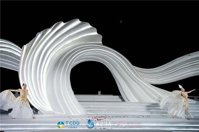 值得一提的是,本届婚庆节的主舞台由知名婚礼艺术设计师阿龙匠心打造,以“爱·无界·时空的诗”为主题,巧妙运用“海螺”与“浪花”作为核心视觉符号。舞台中央的“艺术海螺时空隧道”象征着爱情的无限可能与永恒守护,两侧流动的“海浪飘带”则呼应着情感的起伏与人生的韵律,共同构建出一个兼具东方意境与现代美学的浪漫空间,为所有仪式与表演提供了极具感染力的艺术背景。