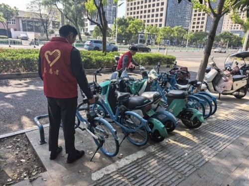 活动当天,身着统一标识服装的志愿者们兵分多路,奔赴预设责任区域。大家分工协作、默契配合,对倒卧在地的单车逐一扶起,检查车辆刹车、车座等关键部位是否完好并及时微调;将停放在非指定区域的车辆合力搬运至划线停车区,按照“车头同向、间距匀称”的标准整齐排列,让杂乱的单车“各归其位” 。过程中,志愿者们还向过往市民发放文明骑行宣传卡片,讲解规范停放的重要性,引导大家养成“随借随还、有序停放”的良好习惯,不少市民在志愿者感召下主动加入整理行列,形成政企民协同共治的生动画面。