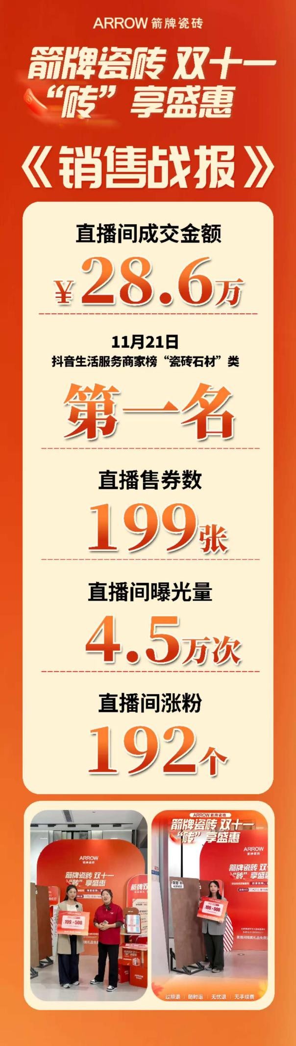 提要:近期,箭牌瓷砖第三期325店效倍增项目暨双十一活动已圆满收官。全国门店势如破竹,再次刷新业绩纪录,不仅提前一周完成总目标,最终业绩倍增收现完成率达134%,收现业绩同比增长274%,这份亮眼的成绩单,是大家同心聚力、线上线下双向联动的又一胜利成果!