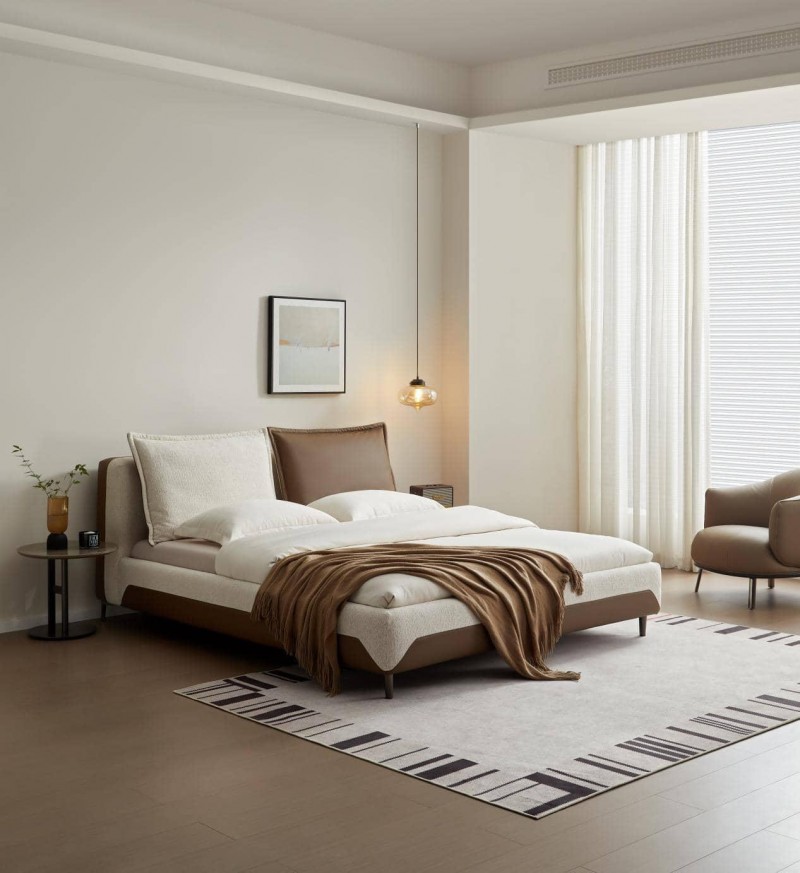 云团软床绵软舒适,皮布双面料搭配,生态科技皮柔韧耐用,仿棉麻亲肤透气,放心贴贴无负担。靠背填充恒压高弹海绵,可移动软包内填微孔式高弹棉+生态鹅毛,饱满挺括。